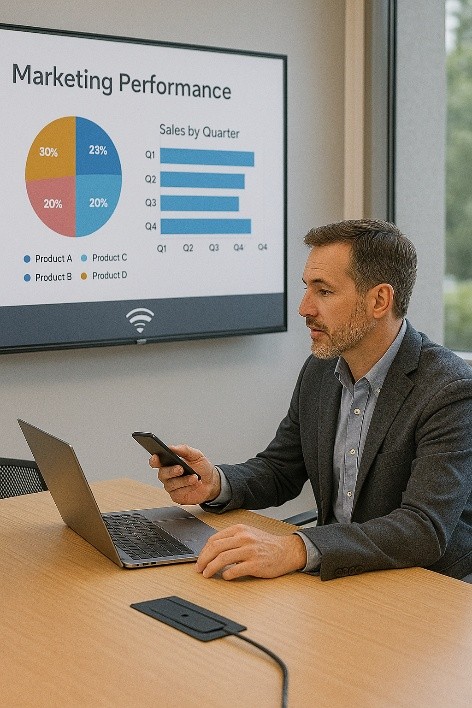 Modern wireless sharing systems eliminate cables and allow anyone—students, staff, guests—to present from their preferred device. Earlier systems struggled with lag or poor compatibility, but current solutions offer: